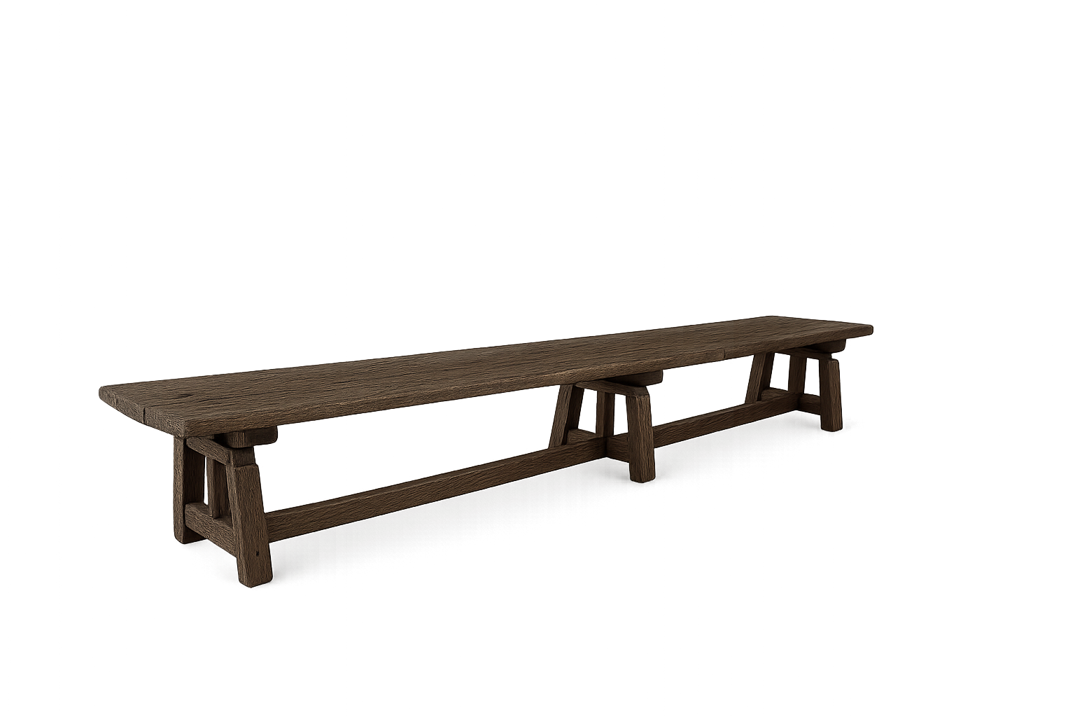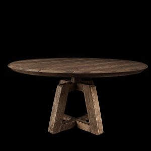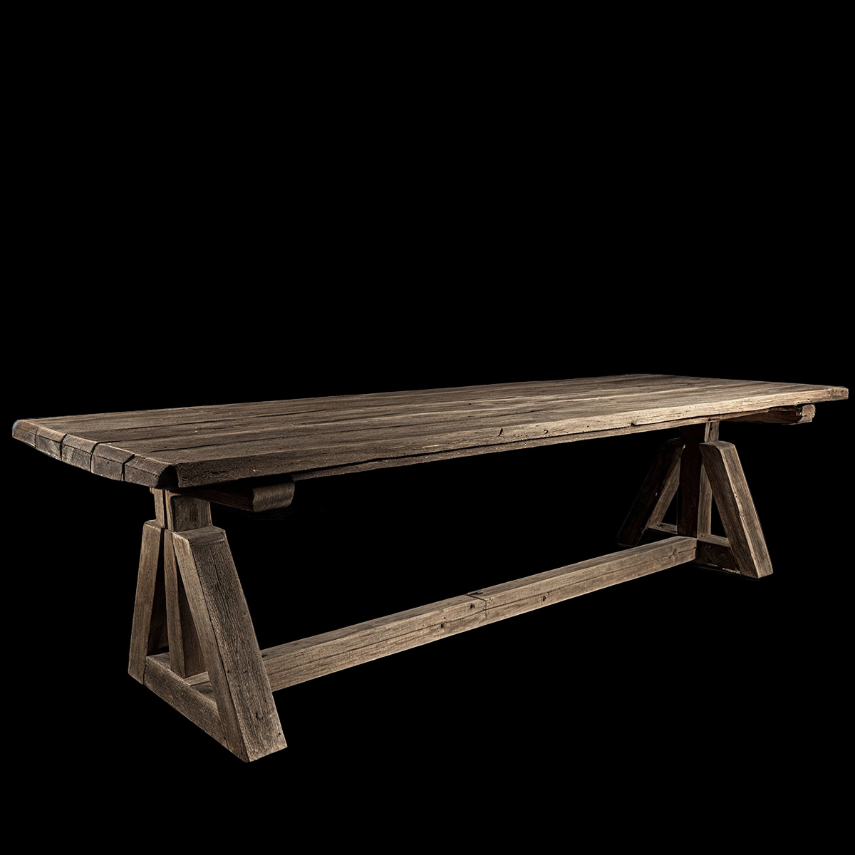 Handcrafted from reclaimed wood, each plank carries the marks of time, enriched with a dark, weathered finish that reveals its natural depth and character. Supported by a sculptural trestle base, the table commands presence with understated elegance, offering a gathering place where strength meets timeless beauty.