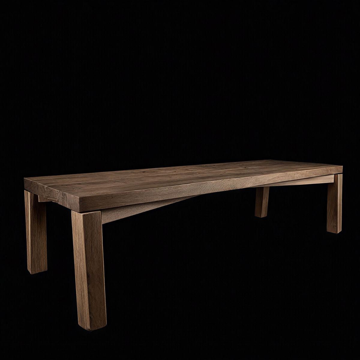 Dinkle draws inspiration from the humblest of beginnings: a local Indonesian bench known for its simplicity. We’ve taken its soul and elevated it into a solid, architectural statement. With a 7cm thick top in either solid or laminated reclaimed Tectonis Grandis wood, Dinkle remains minimal but deeply rooted in strength. The linear finish—originally done with nails in rural benches—is recreated with a circular saw, yet kept asymmetrical and organic, like handwriting in wood. A purist’s dream, Dinkle is raw, honest, and resilient.